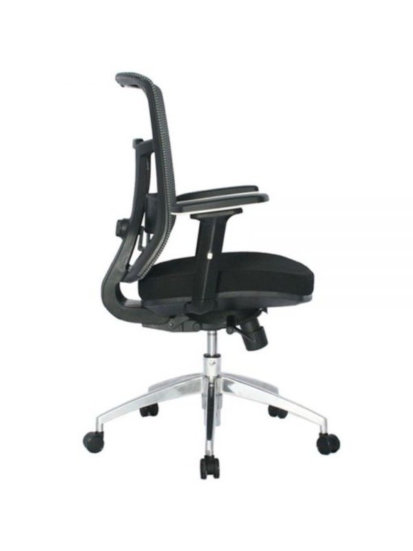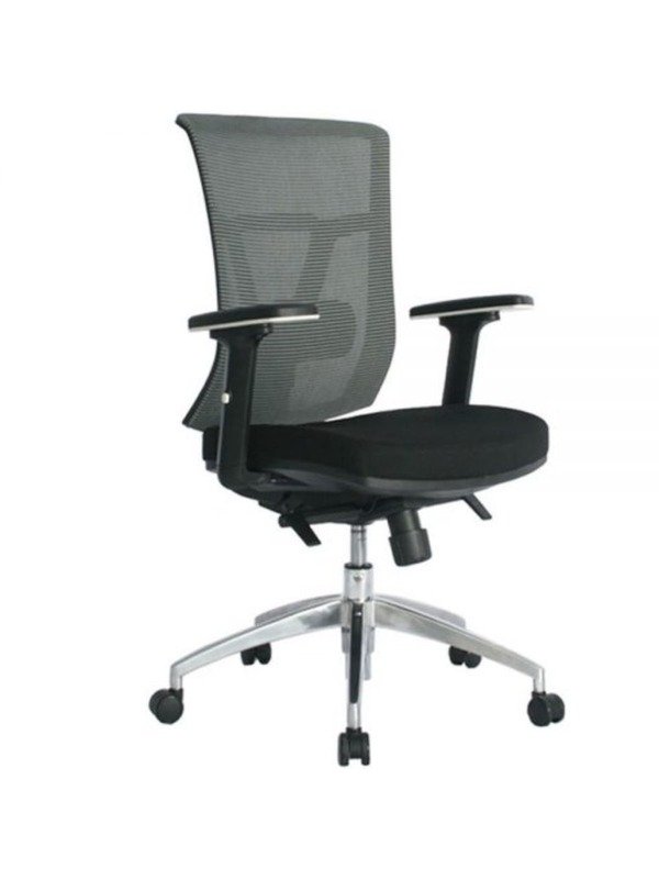 Silla gerencial ergonómica, cómoda, elegante, ideal para largas jornadas laborales, espaldar en malla gris traslucida de alta resistencia, soporte lumbar graduable en profundidad, brazos graduables, asiento en espuma inyectada, tapizado en tela micro suave, sistema basculante, base metálica cromada, rodachinas de suave rodamiento y rápido cambio de dirección